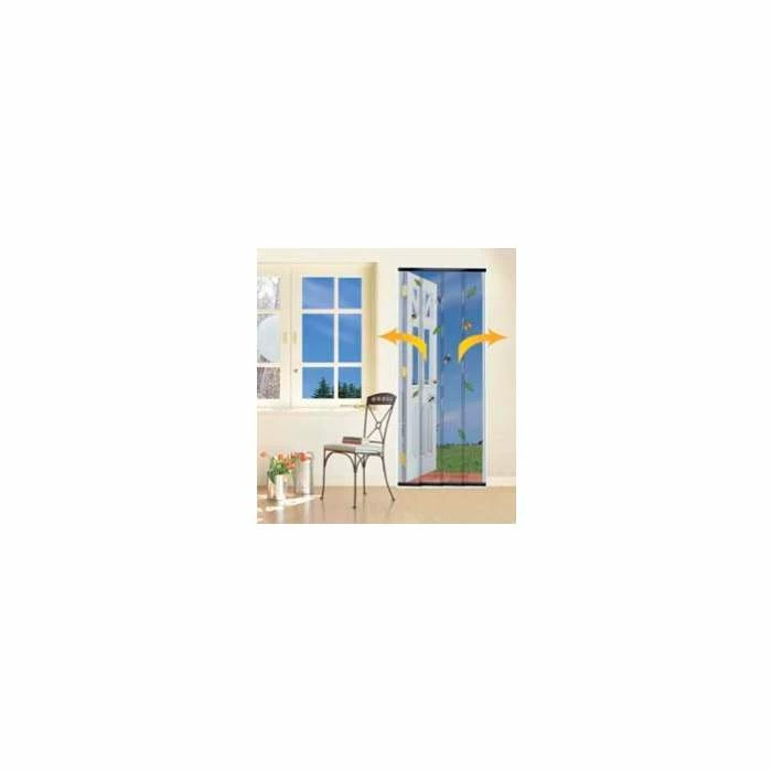 Insect curtain with weighted mesh panels which open easily for people and pets, then swing back into place to let fresh air in but keep insects out.