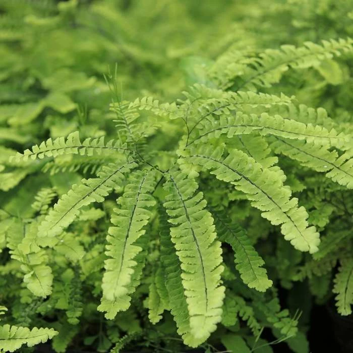 Pretty foliage for partial shade. Position: partial shade to full shade Soil: moist, but well-drained humus-rich soil Rate of growth: average Hardiness: fully hardy This deciduous, clump-forming maidenhair fern slowly spreads by underground rhizomes to form a small colony of decorative foliage. The finger-like green fronds often appear with a pink flush, and are held by glossy, near-black stems, which makes this a very pretty addition to both the woodland floor or shady borders. Garden care: Incorporate lots of well-rotted leaf mould, composted pine needles or garden compost into the planting hole. Cut back decayed fronds in winter to allow new growth to emerge.