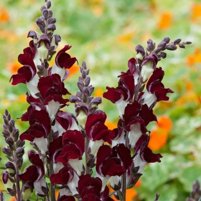 Striking bicoloured flowers. Position: full sun Soil: fertile, sharply drained soil Rate of growth: average Flowering period: June to September Hardiness: half hardy, short-lived perennial Opening from the base of the upright stem in summer, the flowers of this snapdragon are a striking mix of creamy white and rich, burgundy-red. This short-lived plant is usually treated as an annual, but it’s perfect for quickly (and inexpensively) filling gaps in a sunny border. The flowers will also look great when cut for a vase. Garden care:Fill trays with good quality compost and lightly cover the seeds. Water, and place in a cold frame or greenhouse. Pot on when they have put on their first true leaves and the harden off before planting out at 20-30cm intervals, after the frosts have passed. Seeds sown in autumn and overwintered in a cold frame, will produce bigger plants which will flower earlier in the year, than those sown in spring. Sow: August-October or March-April Flowering: June-September Approximate quantity: 500 seeds