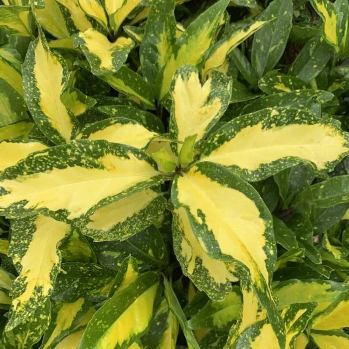Bold variegated foliage. Position: full sun to full shade Soil: any garden soil (except waterlogged soils) Rate of growth: average Flowering period: April Hardiness: fully hardy Lustrous, dark green leaves with yellow-speckled margins and a dramatic, central splash. This boldly variegated, ‘male’, spotted laurel is an ideal evergreen specimen or hedging plant for partly shady areas of the garden. Since it has a tendency to ‘revert’ it’s important to remove any plain green-leaved shoots as soon they appear. Garden care: To promote bushy growth cut back in spring. Apply a generous 5-7cm (2-3in) mulch of well-rotted garden compost or manure around the base of the plant after pruning.