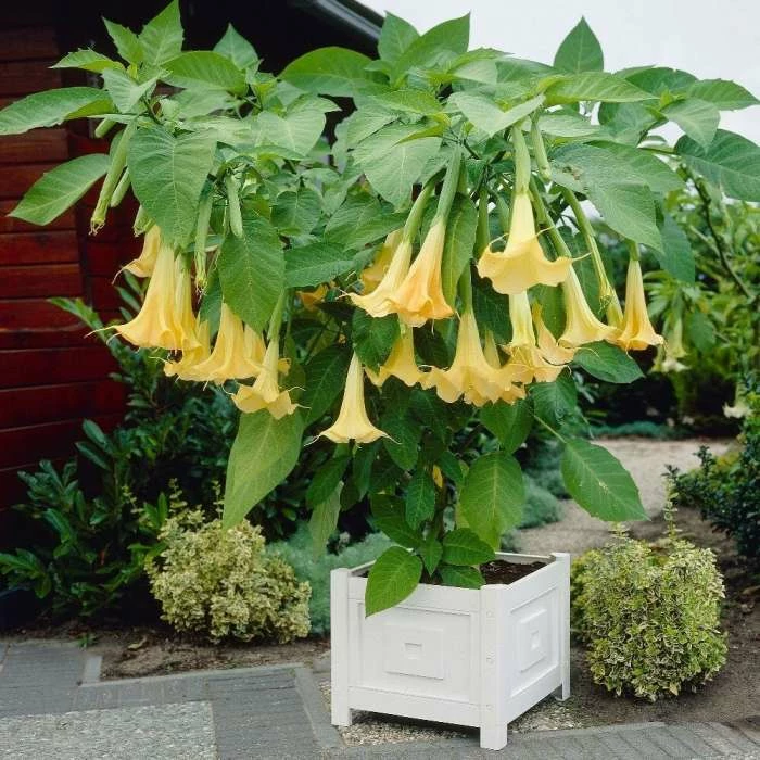 A vigourous, tender shrub with large, yellow, pendant flowers. Position: full sun Soil: fertile, moist, well-drained soil (or loam-based potting compost for container-grown specimens) Rate of growth: fast-growing Flowering period: June to September Hardiness: tender (will need winter protection)Boasting huge (30cm or 12” long) and magnificent, pendulous trumpet-shaped, yellow flowers, this Brugmansia sparkles against the oval, mid-green foliage. Heavenly scented, the flowers exude a strong perfume in summer at the end of the day making this a great specimen plant for a close to the home patio, conservatory or entranceway. The large size of this fast-growing variety can be kept in check by pruning and can start flowering when only around 60cm (2ft) or less. Garden care: During the growing season water regularly, applying a balanced liquid fertiliser every 3-4 weeks. Overwinter under glass in a frost free conservatory or greenhouse. Prune in February or early March.