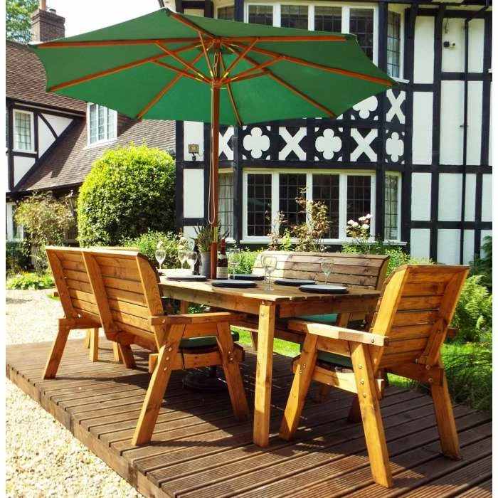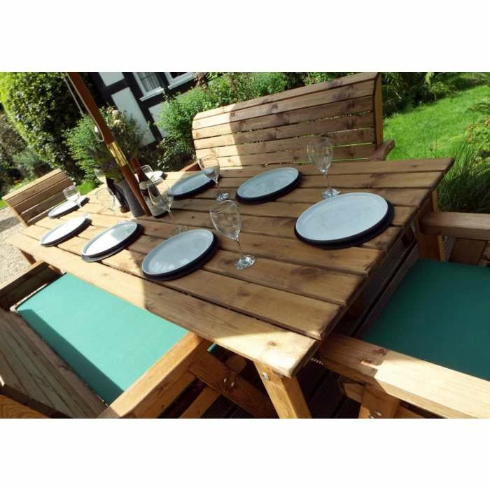 Be the first to review “Charles Taylor Wooden Garden 8 Seater Rectangle Table Dining Bench Set With Green Cushions And Parasol” Cancel reply