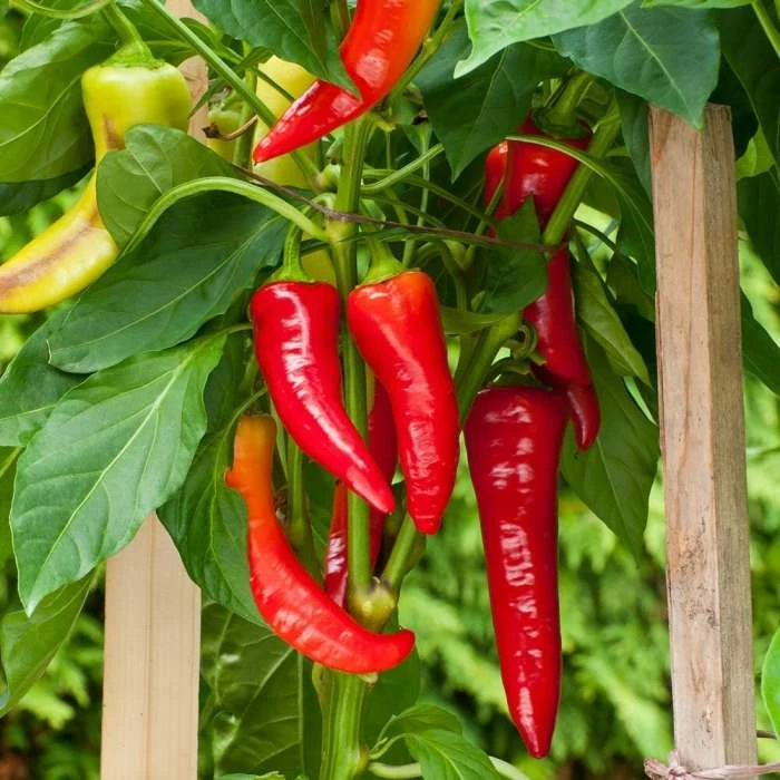 A fiery, edible Cayenne chilli plant plant with long red fruits. Position: full sun Soil: humus-rich, moisture retentive Rate of growth: average Hardiness: tender annual A very hot variety of chilli which can bite back! The long red fruits are produced mid season and can be dried after harvesting, or ground to make cayenne pepper. It forms a bushy plant with lots of branches and small leaves. Garden care: Grow in a greenhouse until the temperatures rise and the frosts have passed. Keep well watered and feed regularly with high-potash tomato food once the fruits begin to form.