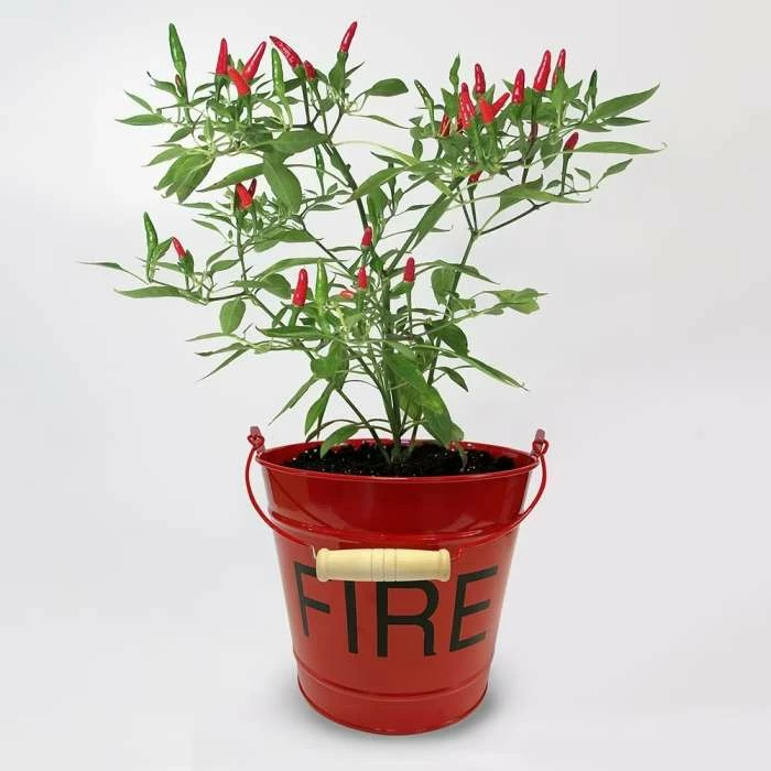 Grow your own chillies on the windowsill. Position: full sun Soil: humus-rich, moisture retentive soil Rate of growth: average Hardiness: tender (will need winter protection) Dimensions: 20cm x 19cm If you like to spice up your cooking, then ‘Demon Red’ chillies, which are classified as very hot, may just be the ticket. They are also relatively easy to grow, forming an abundance of small, upright fruits on very compact plants. They are perfect then for sowing and growing in this metal bucket, which can be popped onto a sunny windowsill. Then, come the summer, you could have a steady supply of chillies close at hand.Each kit contains one metal bucket with handle, potting compost, one packet of chilli ‘Demon Red’ seeds, and full sowing and growing instructions. Growing instructions: Fill 80% of the planter with compost and moisten. Space 7-8 seeds in the planter, cover with a very thin layer of compost and moisten. Save the surplus seeds and compost so you can re-seed the planter in the future. Move to a warm well-lit area; a windowsill is ideal but full sunshine will dry out the compost rapidly. The compost must be kept moist at all times, never being allowed to dry out. Place the planter outside in a sunny position once the risk of frost has passed.