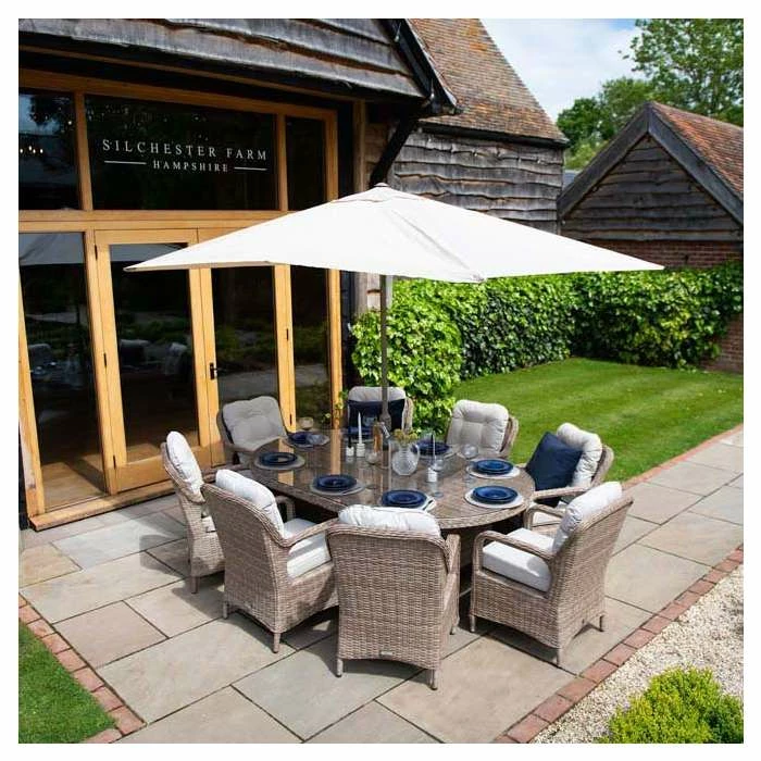 Versatile and multifunctional, transform your outdoor areas into modern living spaces with this classic dining set. The deep seated chairs feature wide armrests and curved backs which are ergonomically designed, paired with the thick and comfy cushions, so you can truly relax into uncompromising outdoor comfort and support. This premium dining set lets you entertain or relax outside morning, noon and night and in any season, giving you the best year-round outdoor living set up.
