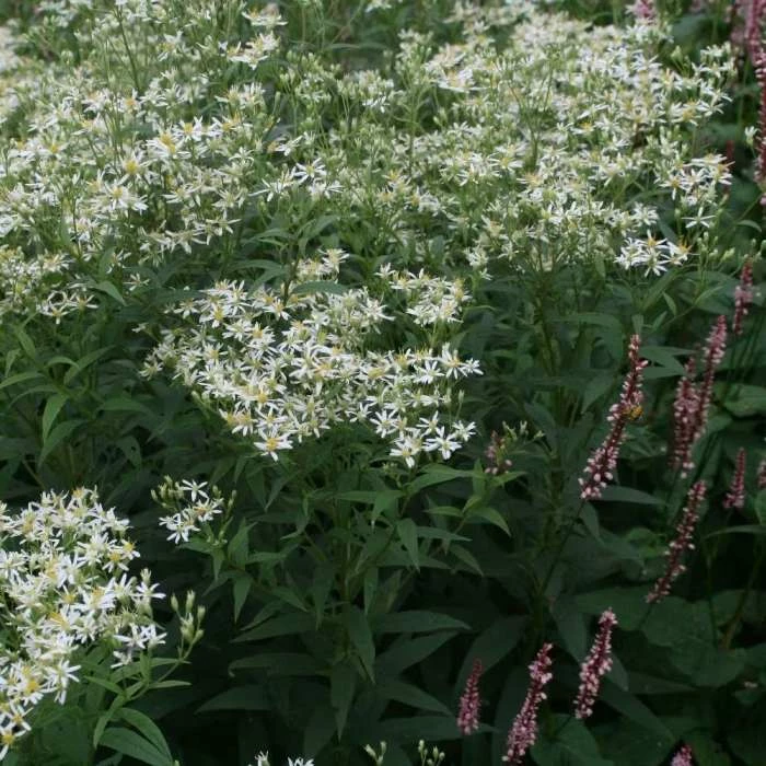 Masses of small white flowers from late summer. Position: full sun or partial shade Soil: fertile, well-drained soil Rate of growth: average to fast Flowering period: August to October Hardiness: fully hardy Masses of yellow-eyed, white daisies (which sometimes have a purple flush), start to appear in flattish clusters from mid- to late summer, above rich green, mildew-resistant foliage. The flowers are attractive to butterflies and good for the vase – and as they tend to appear earlier than many of the other asters, they help get the season off to a great start! It’s a wonderful addition to borders or more naturalised settings, where it will maintain colour and interest well into autumn. Garden care: Leave top growth on through the winter to provide protection and valuable food for birds and insects. Insert twiggy prunings early in the season to provide invisible and effective support. Apply a thick 5-7cm (2-3in) mulch around the base of the plant in the autumn, taking care not to cover the crown.