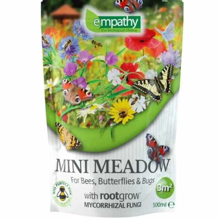 wildflower meadow. Position: full sun Soil: poor, well-drained soil Rate of growth: average Flowering period: May to August This easy to sow mini meadow is the ideal way to achieve the perfect habitat for pollinating insects like bees, bugs and butterflies. The pack contains wild flower seeds and a soil conditioner (Super Seaweed*) and Rootgrow mycorrhizal fungi to ensure they get off to the best possible start. A valuable tool to help teach children the importance of bio-diversity in gardening, this kit is is ideal for both the experienced and novice gardener, as once sown the meadow will require very little aftercare. Each mini meadow will contain a mix of UK native wild flowers including cornflower, poppies, oxeye daisies, corn marigolds and many more. *Super Seaweed is derived from sustainably harvested kelp, which is manufactured using a unique cell burst process. This patented process ensures maximum retention of the growth stimulants found in kelp and contains a wide range of nutrients, vitamins and amino acids. Native species in our mixture: Yarrow – Achillea millefolium – perennial Corncockle – Agrostemma githago – annual Lesser knapweed – Centaurea nigra – annual Cornflower – Centaurea cyanus – annual Foxglove – Digitalis purpurea – biennial Viper’s bugloss – Echium vulgare – biennial Galium verum – Lady’s bedstraw – perennial Corn marigold – Glebionis segetum – annual Oxeye daisy – Leucanthemum vulgare – perennial Field Forget-me-not – Myosotis arvensis – annual Common poppy – Papaver rhoeas – annual Selfheal – Prunella vulgaris – perennial Meadow buttercup – Ranunculus acris – perennial White campion – Silene latifolia subsp. alba – perennial Red campion – Silene dioica – perennial Salad burnet – Sanguisorba minor – perennial Great mullein – Verbascum thapsus – perennial Garden care: Clear the area ready for sowing by removing weeds and other debris before sowing the seed in autumn or spring. Keep well watered and germination should commence within 28 days, although this will depend on the environmental conditions. Once the flowers have faded at the end of the year, mow the meadow at a high setting.