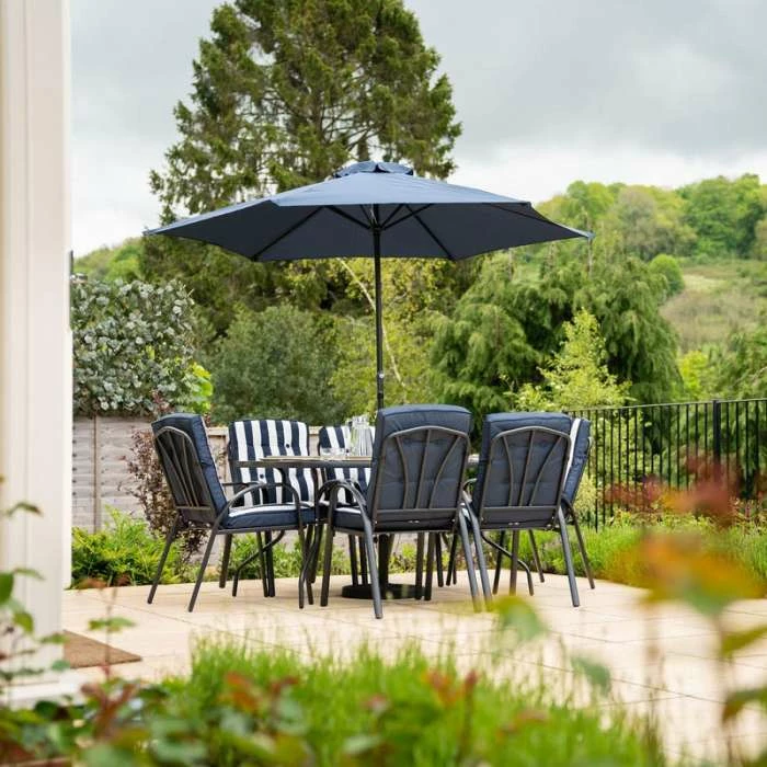 This brilliant six seater garden dining set is perfect for enjoying a big family lunch in the sunshine. With a fantastic high quality parasol that comes with its own crank you can enjoy spending time in your garden without having to worry about the harsh heat. The gorgeous reversible cushions are thick, luxurious and highly versatile. Made from extremely durable powder coated steel this dining set has excellent resistance to adverse weather conditions and is easy to put together.