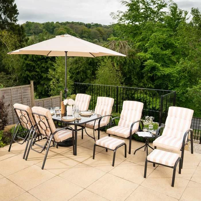 This brilliant six seater garden dining set is perfect for enjoying a big family lunch in the sunshine. This set comes with two extra stools which are incredibly useful for accommodating any extra guests and for saving space. With a fantastic high quality parasol that comes with its own crank you can enjoy spending time in your garden without having to worry about the harsh heat.
