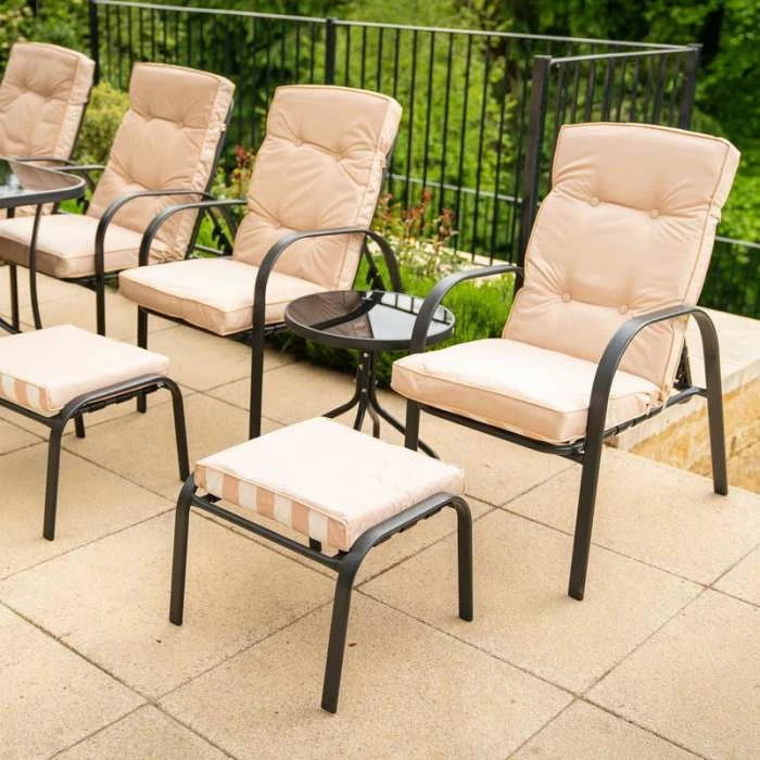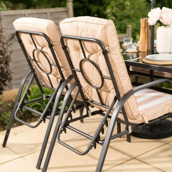 The gorgeous reversible cushions are thick, luxurious and highly versatile. Made from extremely durable powder coated steel this dining set has excellent resistance to adverse weather conditions and is easy to put together.