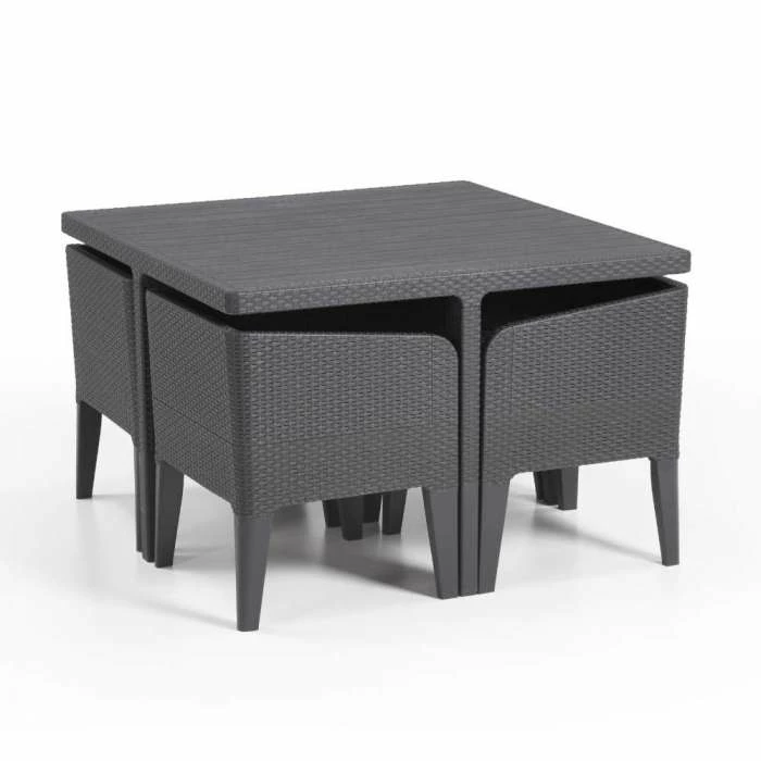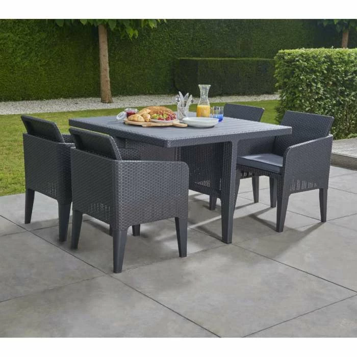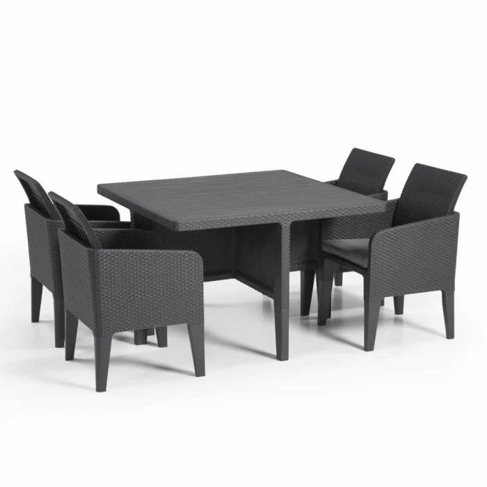 Made from low-maintenance, UV protected polypropylene, this 5-piece garden dining set will stay looking stylish season after season, and due to its minimal assembly, you’ll be enjoying it in no time at all once it reaches your door. The four chairs includes seat cushions and backrests so you’re seated in comfort, which can all be laid down for ease of storage when your dinner or garden party comes to an end. With a UV protected resin, which is durable through use after use, it will resist rusting, decay, or peeling, so you can rest assured your furniture will last. A flat wicker effect finish in a contemporary graphite grey.