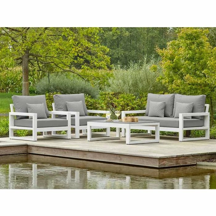 Made from tough powder-coated aluminium frames and emphasising today’s modern garden furniture design. The New Lagos Lounge Sets mirror the popular Mallorca range at a more budget friendly price point. 100 % All-Weather, LIFE Cushions have a unique design that allows water to penetrate through the cushion. Using a micro-porous filling and an outer cover of high quality, UV stabilised, woven textilene, vastly reduces the likelihood of mould, mildew or rot setting in. Allowing you to leave them out during the spring and summer months in confidence.