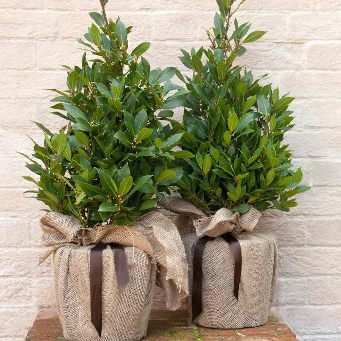 Pyramidal pruned bay. Shown above with optional gift wrap, which can be added during the checkout process. If not gift wrapped, plants will be supplied in simple nursery pots, suitable for potting into terracotta pots or wooden planters. Sold individually. Position: full sun or partial shade Soil: fertile, moist but well-drained soil Rate of growth: slow-growing Flowering period: March to May Hardiness: frost hardy (needs winter protection) These evergreen bay laurel pyramids are ideal for punctuating a formal or contemporary planting scheme. Since the lustrous, aromatic, dark green leaves, valuable for culinary use, are susceptible to wind scorch provide a sheltered, sunny or partially shady site and winter protection in cold areas. The mature leaves may be used fresh or dried in bouquet garni, for flavouring stocks and sauces. Garden care: Keep well-watered during the growing season and feed with a slow-release fertiliser. Clip established plants lightly twice during the summer months to retain a balanced shape, using secateurs not shears. Please note the height specified is the overall height of the plant on arrival including the pot.