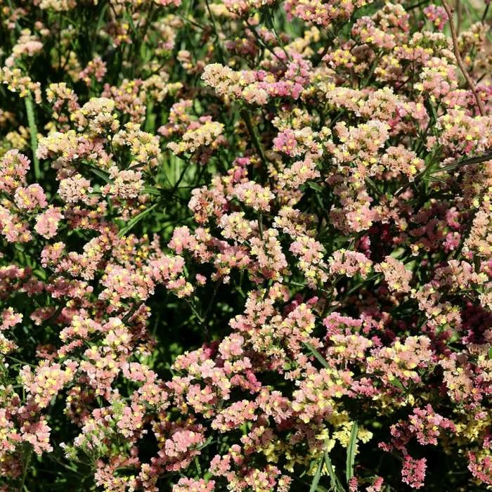 An apricot flowering statice cut and dried flower annual seed. Position: full sun Soil: well-drained soil Rate of growth: average Hardiness: half-hardy annual An easy to grow, ‘everlasting’ and ever-popular flowering annual forming a basal rosette of rich green foliage from which abundant sprays of apricot-pink, papery blooms emerge on wiry stems ripe for cut flower arrangements. Loved by pollinating insects, and incredibly long-lasting, a dried arrangement will hold its colour throughout the winter. Growing instructions: Sow under glass from February onto good quality seed compost and lightly cover with vermiculite. Germination takes approximately 2-3 weeks at 64-68°F (18-20°C). Transplant seedlings when large enough to handle into pots or trays and harden off for a few weeks before planting out after all risk of frost, 25-30cm (10-12″) apart. Pinch back any ‘leggy’ seedlings when planting. To dry flowers for winter displays, cut stems just before flowers are fully open and hang small bunches upside down in a cool ventilated area. Sow: February to April Flowering: July to September