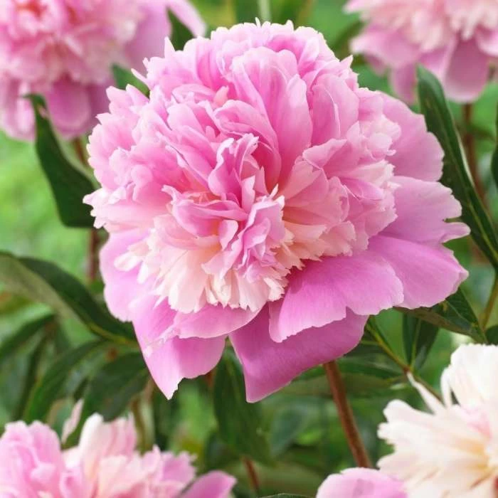 A soft pink flowered herbaceous perennial . Position: full sun or partial shade Soil: fertile, moisture-retentive yet well-drained Rate of growth: average Flowering period: June to July Hardiness: fully hardy ‘Sorbet’ is a softly textured, delicately coloured, fragrant light pink, double flowered peony with cream coloured frills. Combine this gorgeous mid-late season bloomer with the delicious fragrance of Rosa ‘Mary Rose’ or the delightful pinkishness of ‘Gertrude Jeykll’. Garden care: Deadhead after flowering. In early spring apply a balanced slow-release fertiliser around the base of the plant and mulch with well-rotted compost or manure.