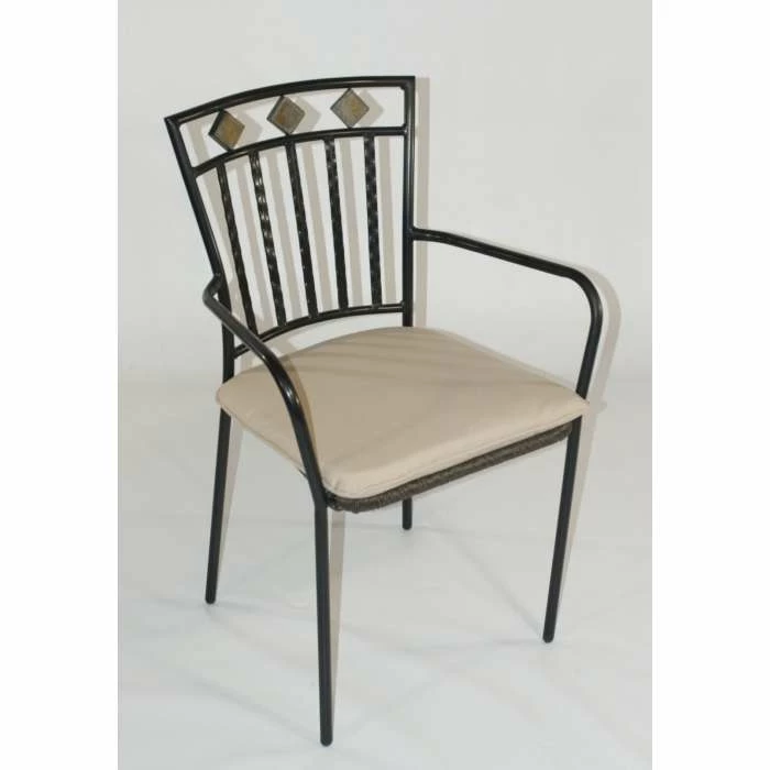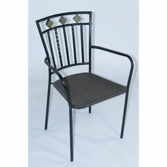 A beautiful synthetic wicker armchair with a black tubular steel frame, featuring three dark natural slate diamonds on the back rest for a distinctive finish.