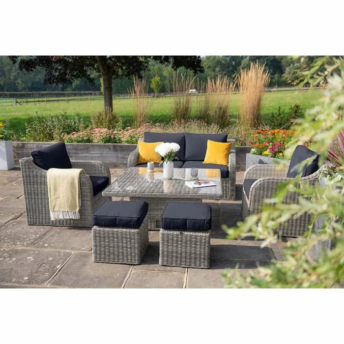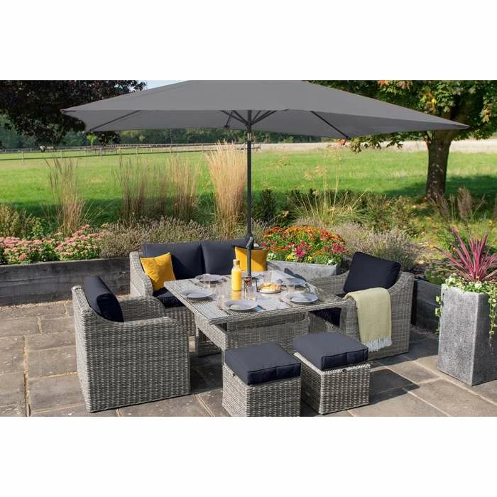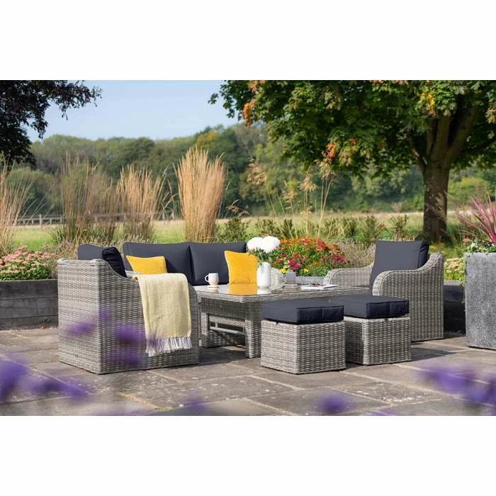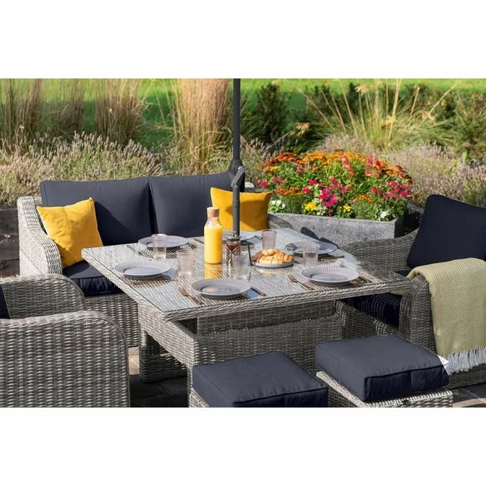 Built for convenience, every piece of this set can be adjusted to be used your way, with an easy-to-use rising table and the footstools double as extra seating when you need. The perfect way to turn your outdoor areas into multifunctional spaces.