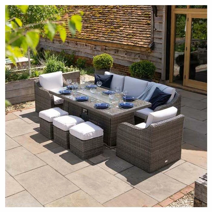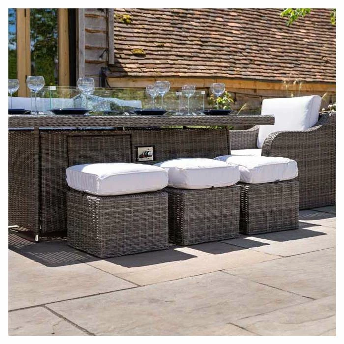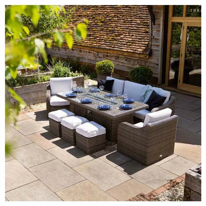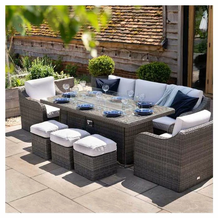 Dine and entertain in comfort and style. Designed for modern outdoor living, this set can be arranged any way you want and comes with a lot of versatile extras. The deep, high-backed seating is lined with thick, foam-filled cushions that give unparalleled comfort and support.