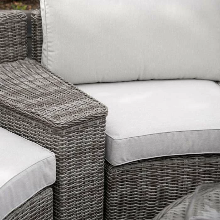 The two deep-seated sofas have high backs, thick armrests and thick, foam-filled cushions offering unparalleled comfort and support. Two handy storage baskets connect the two sofas, and the two footstools double as extra seating when you need it.