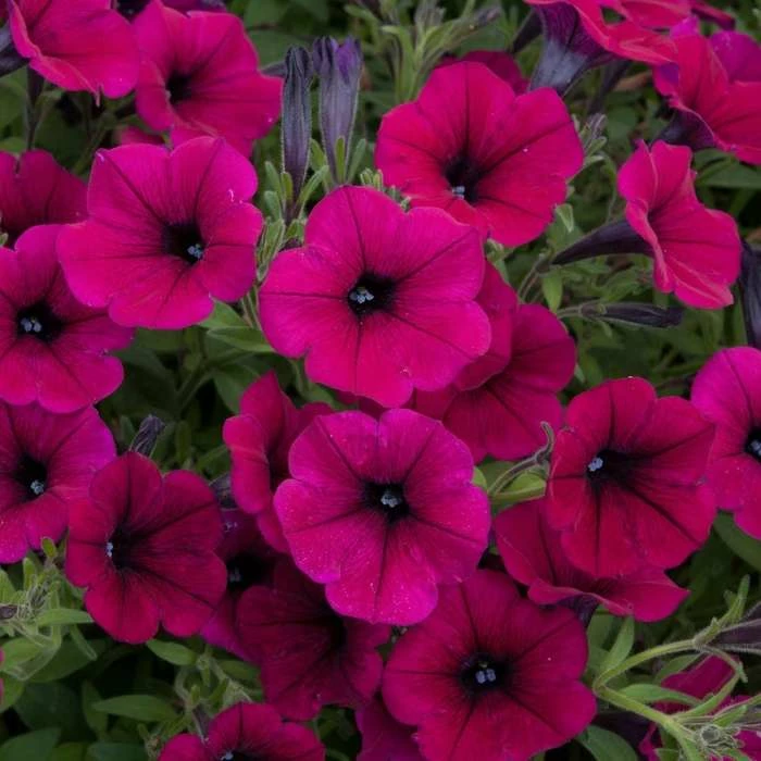 A trailing, magenta-crimson petunia bedding plant for baskets and pots. Position: full sun Soil: moderately fertile, humus-rich, well-drained soil Rate of growth: average to fast Flowering period: May to the first frosts Hardiness: tender (needs frost protection) One of the most impressive of the trailing petunias, ‘Shock Wave’ produces an abundance of magenta-crimson flowers throughout the summer. It looks sublime when cascading over the edges of a pot or hanging basket either or its own, or teamed with deep purples, softer pink or silver. Grown individually in cell trays, each plant measures about 7 – 10cm tall (from the base of the root to the top of the plant). They are ideal for keen gardeners who have a greenhouse where the plants can be grown on until they are ready for planting out in the garden once all chance of frost has passed. Please note: We grow these especially for you, so we do request that full payment is made when you place your order. See above for despatch dates for this particular plant. To ensure that your plants arrive in the best possible condition each pack will be despatched individually. Please also be aware that the pot and/or hanging basket in the photos are not included. Garden care: In May when all risk of frost has gone, transplant outdoors where the plants are to flower. Keep well watered and feed at regular intervals with a high potash fertiliser (such as Tomorite).