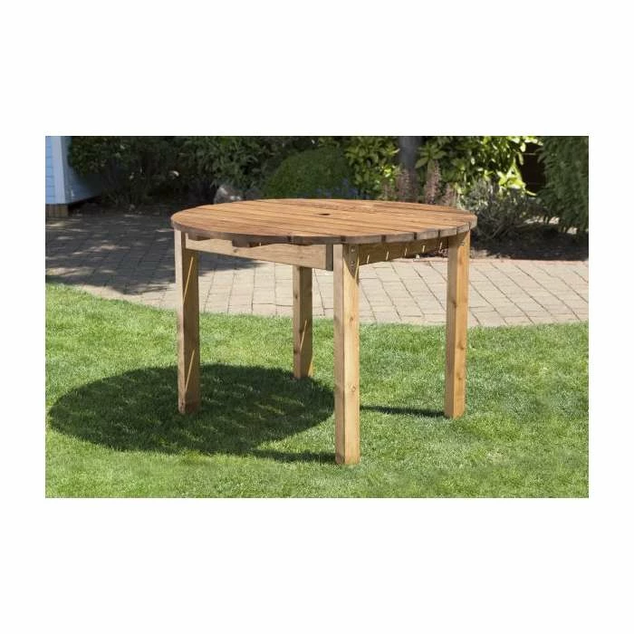 This comfortable four seater round dining table built from strong and long lasting hardwood boasts years of enjoyment with friends and family. Traditional handcrafted garden furniture made in the UK and delivered fully treated and assembled.