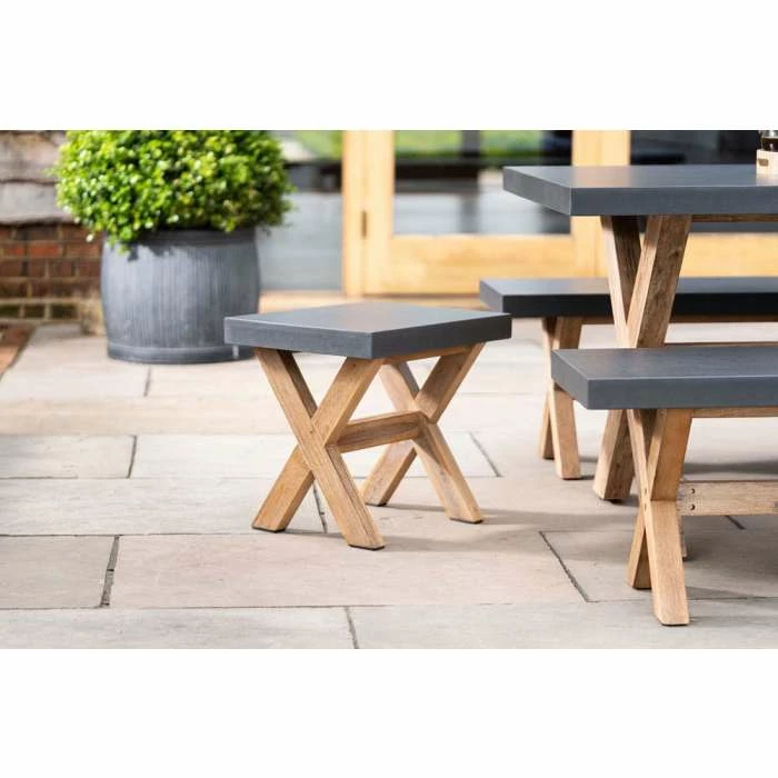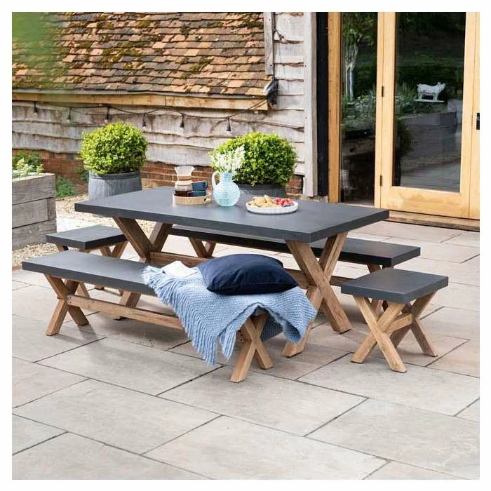 This Rustic dining set from Primrose Living brings a farmhouse chic to your kitchen or garden decor, without any compromises on quality. The acacia wood forming the heart of the table and benches has been selected to fit right into your style, while the cement fibre tabletop is designed to be durable yet manageable.