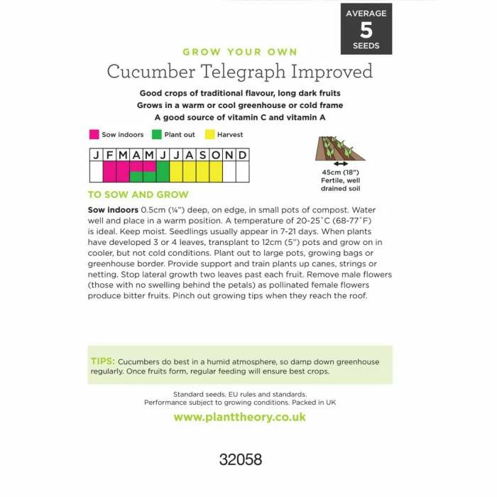 Our cucumis sativus Cucumber “Telegraph Improved” seeds are an upgraded version of the classic Telegraph cucumber first introduced in 1897. This popular greenhouse variety produces high yields of long, straight cucumbers with a smooth skin and crisp, great-tasting flesh. In addition to being a must-have for salads, it’s also great for exhibiting.