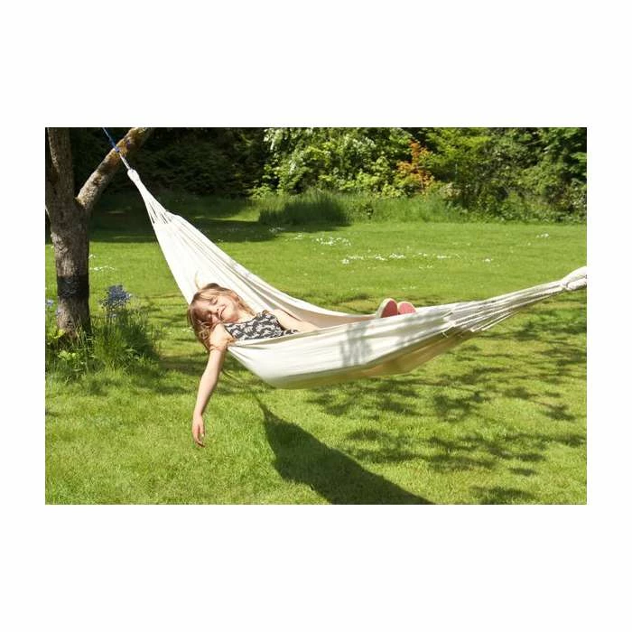 This gorgeous garden hammock is the perfect accompaniment to lazy summer days relaxing in your garden. With a double berth it is extra-wide so you can stretch out alone and make the most of the extra space or cuddle up to a loved one as you watch the world go by together. In a traditional ivory colour and woven from a sturdy cotton and polyester blend this lovely hammock can be a relaxing retreat in your garden for years to come. This hammock has been tested to a weight of 200kg (31.5 stone) and comes with support ropes to help you attach your hammock safely and securely.