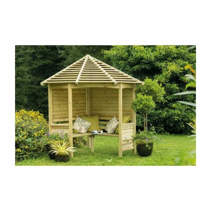 - Corner arbour seat featuring a slatted roof design