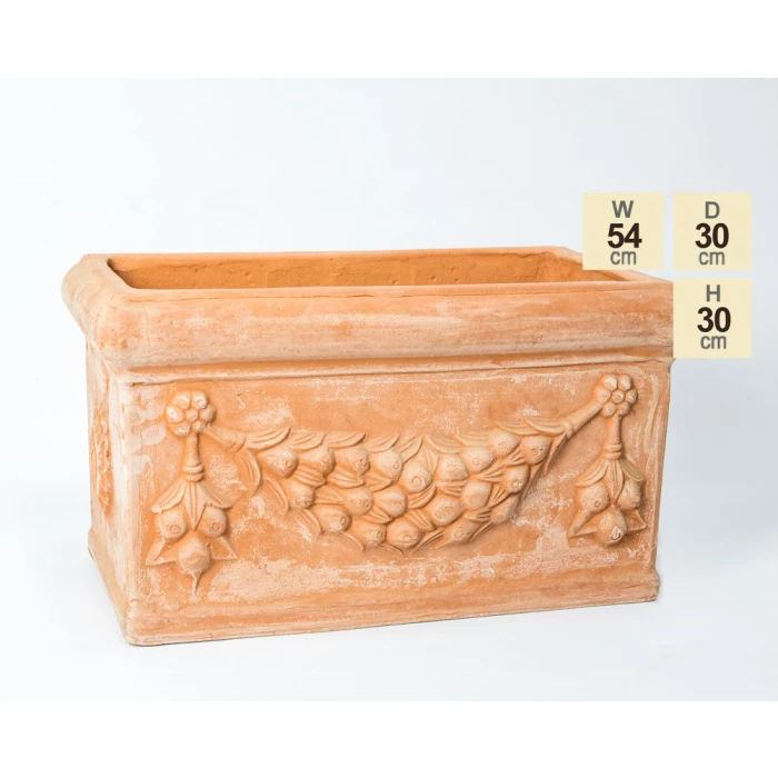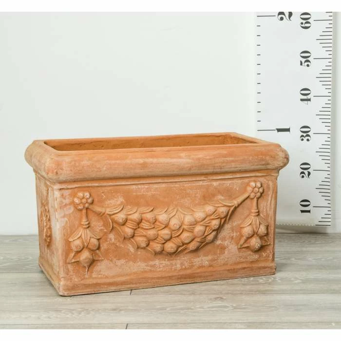 This traditional terracotta trough planter is a striking addition to any garden or patio. The traditional earthy colour and ornate, antique-style detailing is perfect for complementing plants, flowers and topiary. A timeless looking material for pots and planters, terracotta has been a popular garden staple for hundreds (if not thousands) of years. This sturdy material is great for resisting bad weather and is also slightly porous, resulting in healthier roots and plants.