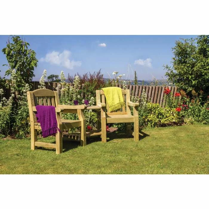 A romantic piece of garden furniture, designed with couples in mind. The Emily Love Seat has two chairs angled slightly towards one another, with a small table between the two. Use for a romantic evening with your significant other or delight in your family or friends company.